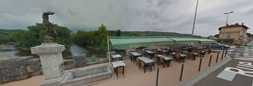 Fontaine située sur le trottoir au bout de la terrasse de l'hôtel-restaurant "Au Faisan Doré" qui surplombe la rivière d'Ain à l'extrémité Est du pont.