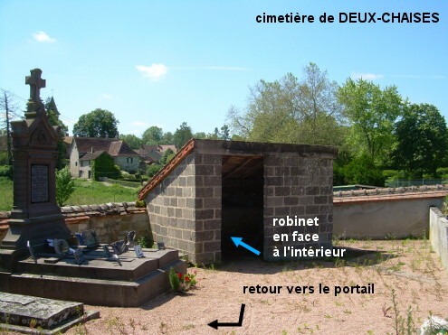 Le cimetière est implanté côté gauche à la sortie du village sur la D231 direction Treban, peu après le panneau de fin de village. Le robinet est à l'intérieur du cimetière sous l'appentis qui est dans le coin avant gauche. 1) En provenance de Monestier sur la D22, tourner à droite juste après l'église : c'est la D231 direction Treban, mais il n'y a qu'une flèche pour ceux qui roulent en sens opposé. Ensuite, 70 mètres après le panneau de fin de village on sera à côté du portail du cimetière. Entrer et se diriger vers le coin à gauche (début en macadam et suite gravillonnée) jusque sous l'appentis (à 50 mètres) pour trouver le robinet. 2) En provenance de Treban sur la D231, on verra le cimetière côté droit juste derrière l'angle d'une route adjacente (route du Poteau) et peu avant le panneau de début de village.