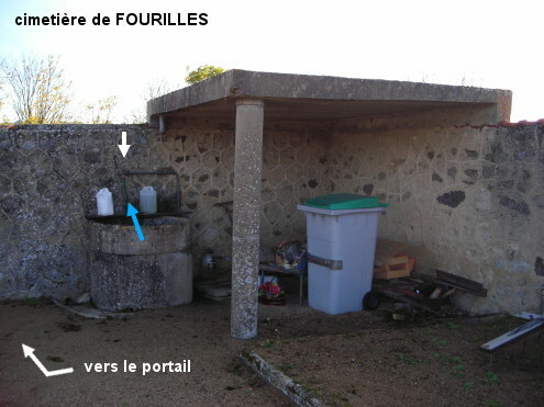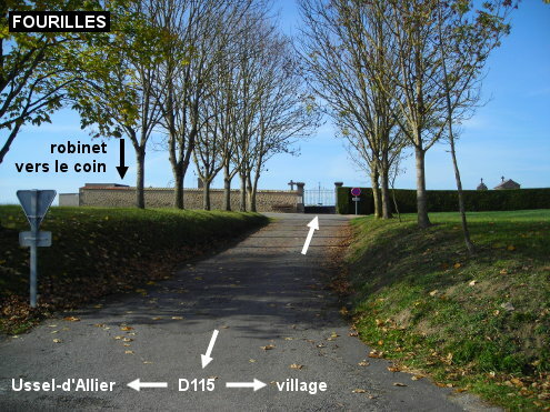 Le cimetière est implanté côté droit à la sortie du village sur la D115 en direction d'Ussel-d'Allier, 280 mètres après le panneau de fin. Il est desservi par une allée asphaltée de 40 mètres (étant un peu en hauteur, on le voit assez bien côté gauche lorsque l'on circule dans l'autre sens, en direction du village). Entrer et se diriger vers le coin gauche pour trouver le robinet sur le mur au-dessus de la margelle d'un ancien puits bouché, à côté de l'abri implanté dans le coin.