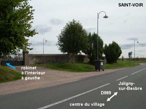 Le cimetière est implanté côté droit 240 mètres après le panneau de début de village sur la D989 en provenance de Jaligny-sur-Besbre (juste après la borne du point kilométrique 18), et juste après un dos d'âne. Un parking en terre battue le précède. Son portail donne sur la route mais il est situé très en retrait par rapport au mur d'enceinte (on ne le voit donc pas de loin). Le robinet est à l'intérieur du cimetière à gauche du portail.