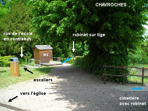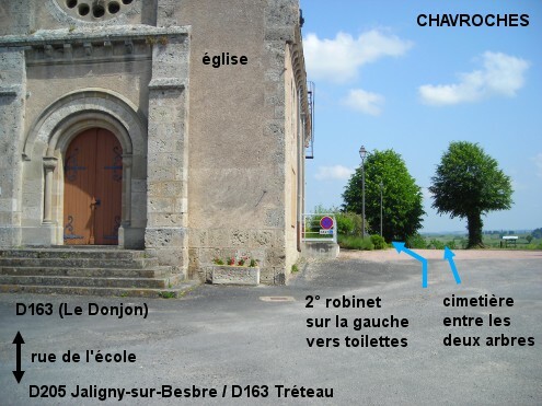 Ces toilettes se trouvent devant le cimetière qui est situé derrière l'église érigée sur les hauteurs du village, à 150 mètres de la D163. Suivre le fléchage ''église-château''. 1) Sur la D205 en provenance de Jaligny-sur-Besbre, au carrefour avec la D163 qui part à droite en direction de Tréteau, tourner à gauche dans la rue qui monte (début en sens unique avec une pente soutenue) et continuer jusqu'à voir l'église côté droit. Devant l'église, entrer à droite sur la grande esplanade et se diriger vers le fond vers l'arrière de l'église (parallèlement à la rue de l'école), on aperçoit déjà les deux arbres encadrant l'entrée du cimetière situé en léger contrebas. On pourra trouver un robinet à l'intérieur du cimetière à droite du portail. On verra un autre robinet à l'extérieur sur la gauche, fixé sur une tige plantée devant la haie entourant le cimetière et avant le cabanon des toilettes sèches (à 440 mètres du carrefour ouest D205 / D163). 2) Sur la D205 en provenance de Trézelles, au carrefour sud avec la D163, tourner à gauche puis aussitôt à droite (rue Merle) pour rejoindre au bout de 80 mètres la montée du Château (à droite au carrefour en T). Ensuite idem ci-dessus (encore 200 mètres à parcourir). 3) Sur la D163, en provenance du Donjon, peu après le panneau de début de village, tourner à droite et grimper sur 150 mètres pour voir côté gauche en surplomb le chalet des toilettes desservi par un escalier juste avant l'arrière de l'église. Il est plus pratique de faire le tour en passant devant l'avant de l'église pour arriver jusqu'au robinet à côté du chalet.