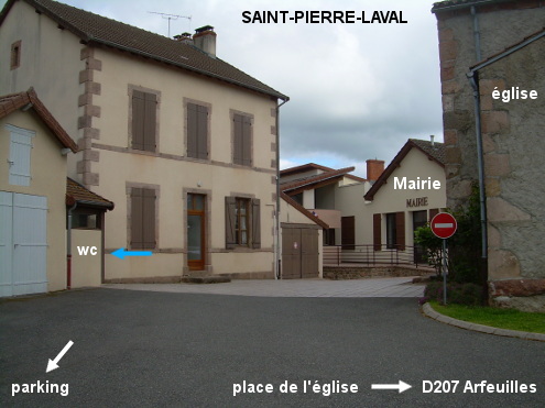 Les toilettes se trouvent en face de la Mairie et de l'église, près de la D207. 1) En provenance de Saint-Martin-d'Estréaux sur la D207, juste après le carrefour à droite avec la D507 (qui rejoint la D707, ex-RN7 désormais à circulation plus faible, en direction de Saint-Prix puis Lapalisse), tourner à droite avant l'église. Continuer jusqu'à être à côté de l'entrée de l'église, à droite de la voie le petit bâtiment des toilettes accolé aux autres bâtiments a sa porte (à 60 mètres de la D207) orientée face à nous et à la Mairie (sur la droite) que l'on ne voyait pas. N.B. : Pour faire couler l'eau dans le lavabo, il faut maintenir le bouton appuyé. 2) Sur la D207 en provenance d'Arfeuilles, quand on voit l'église côté gauche, on peut entrer sur le parking puis se diriger au fond à gauche de l'église pour trouver les toilettes (à 30 mètres) en regard de la Mairie qui nous fait alors face.