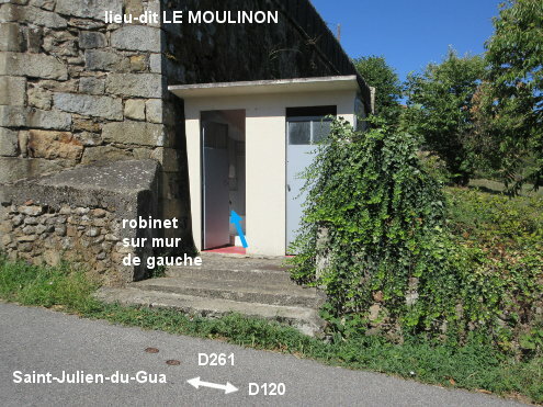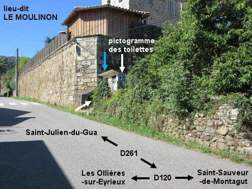 Les toilettes se trouvent côté droit au début de la D261 direction Saint-Julien-du-Gua. 1) En provenance des Olllières-sur-Eyrieux sur la D120, peu après le carrefour à gauche avec la D344 venant de Pranles et le pont sur la rivière l'Auzène, tourner à gauche dans la D261 en direction de Saint-Julien-du-Gua, pour arriver 50 mètres après à côté du petit bâtiment des toilettes implanté côté droit juste avant un grand bâtiment et après de la végétation qui le masque partiellement. On voit néanmoins sur le côté du cabanon le grand pictogramme normalisé signifiant ''toilettes''. Il s'agit d'une petite cabine WC turc dans laquelle il y a un robinet sur le mur gauche, plutôt près du sol qu'en hauteur. 2) En provenance de Saint-Julien-du-Gua, peu après le panneau annonçant le stop à 150 mètres et juste après un passage piéton, traverser pour rejoindre le cabanon des toilettes sur le côté gauche, que l'on ne découvre qu'au dernier moment. 3) En provenance de Saint-Sauveur-de-Montagut sur la D120, le carrefour à droite avec la D261 est pré-signalé, mais dans ce sens il n'y a pas de flèche visible au début de la D261.