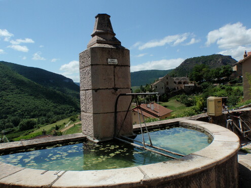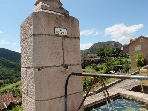 Fontaine située en haut du village, au dessus de la rue de la Fontaine et de la D640 qui monte au village. Avec un lavoir en dessous, et une vue superbe sur les gorges du Tarn. C’est une résurgence. Notée : eau potable, mais bon, on hésite …