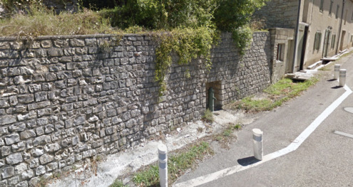 Sur la D546, à droite (dans le sens descendant) avant la route d'accès au village dans un creux du mur de pierre