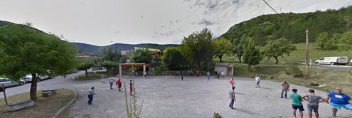 Venant de Sisteron. En entrant dans Montfroc, il y a une petite place pour boulistes à gauche. Sous le porche se trouve la borne.