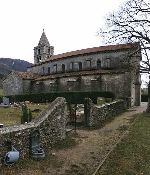 La fontaine est à l'extérieur du cimetière, facilement accessible à vélo par une allée en terre. Et on profite de la belle vue sur l'église cistercienne de Léoncel (XIIe siècle)