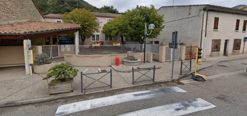 Dans le sens Nyons Rémuzat, la fontaine se trouve sur la gauche dans l'entrée de Sahune, à côté de l'école Maternelle.