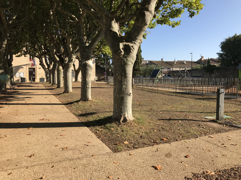 La borne se trouve devant la mairie le long de la nationale entre l'allée de platanes et une aire de jeu pour enfants.