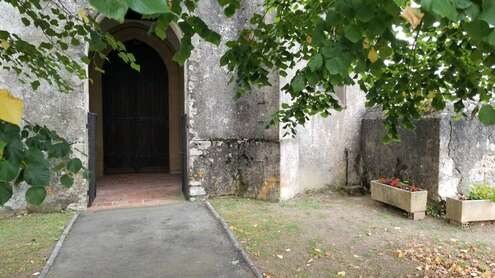 Robinet juste à droite de l'entrée principale de l'église, à côté du mur du cimetière.