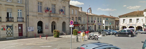 Sur la place devant la mairie, entre la rue et le parking, à côté d'une boite postale jaune.