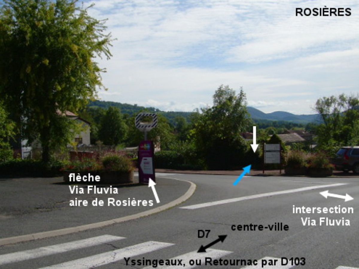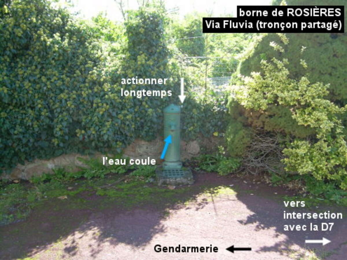 Cette borne se trouve dans un angle de l'intersection entre la D7 direction Yssingeaux et une partie en itinéraire partagé de la Voie Verte ''Via Fluvia''. N.B. : Il s'agit d'une borne vert foncé de modèle « P.A.M. Neptune » à molette droite et il faut actionner celle-ci pendant longtemps pour faire couler l'eau. 1) Sur la ''Via Fluvia'' en venant de Beaulieu, en descendant sur la traversée de la D7 on verra côté gauche derrière le carrefour un grand panneau rectangulaire vertical couleur rose indiquant la direction de l'aire de Rosières de la Via Fluvia, et une flèche ''La Galoche'' pointant en face. Juste après cette traversée, chercher la borne dans le coin droit près des buissons. 2) Sur la D7 en provenance d'Yssingeaux (dans cette ville, suivre d'abord la direction de Retournac sur la D103 puis après le pont sur la RN88 et juste après le rond-point, quitter la D103 : ne pas suivre la flèche Rosières, mais tourner à gauche en direction du lieu-dit Vaunac dans la D7 sur laquelle il y a moins de circulation), peu après le panneau marquant le début de la ville de Rosières il y a une flèche de présignalisation pointant à gauche ''circuit des paysages, ravin de Corbœuf ''. Traverser sur le deuxième passage piéton, celui juste derrière ce carrefour, pour trouver la borne au début du côté droit de la rue adjacente, peu visible contre la haie arbustive. 3) En provenance du centre-ville sur la D7, en direction de Retournac ou d'Yssingeaux, surveiller le côté droit de la route pour repérer le grand panneau rose de la Via Fluvia. Monter alors sur le trottoir juste avant le carrefour pour chercher la borne côté droit dans l'angle avec la rue adjacente.