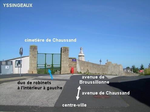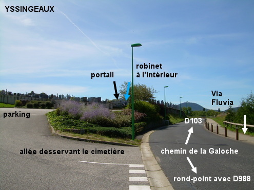 Le cimetière est implanté à la périphérie nord de la ville. Il comporte des entrées très éloignées situées dans des rues secondaires. 1) En provenance de Saint-Maurice-de-Lignon (prendre la ''route Nationale'' qui est la rue principale, en direction du sud, qui se prolonge en une petite route grosso modo parallèle à la RN88) sur la petite route qui passe par le lieu-dit Alinhac puis un court tronçon de D105 et enfin la D988 (on entre dans la ville juste après un rond-point), au rond-point suivant prendre la deuxième sortie à droite (chemin de la Galoche) en direction de la gare routière et de l'aire de la Via Fluvia. Cette Voie Verte venant de Lapte longe alors en direction de Rosières la route dont elle est séparée par des potelets en bois. Surveiller ensuite le côté gauche de la route et prendre la troisième à gauche : c'est l'allée menant à un parking du cimetière et à l'un de ses portails. N.B.1 : Il faut pousser fort ce portail dont les battants frottent l'un sur l'autre. On trouvera alors un robinet tout de suite à droite. 2) En provenance de Retournac sur la D103, après le carrefour avec à gauche la D42 venant de Beaux et du lieu-dit Marnhac, et à droite la D7 venant de Rosières et du lieu-dit Vaunac, au premier rond-point continuer tout droit pour franchir le pont qui enjambe la RN88, continuer aussi tout droit au deuxième rond-point où l'on peut déjà voir une flèche indiquant la direction de l'aire d'Yssingeaux de la Via Fluvia. Au troisième rond-point à l'intersection avec deux rues secondaires et la Voie Verte ''Via Fluvia'' (qui arrive de Rosières sur la droite sur un tronçon en itinéraire partagé, et continue à gauche en direction de Lapte), tourner à gauche dans la troisième sortie (chemin de la Galoche) en direction de l'aire de la Via Fluvia (il y a aussi un marquage à la peinture en couleurs sur la chaussée). Cette Voie Verte longe alors la route côté gauche derrière des barrières de protection en bois. Au rond-point suivant continuer tout droit (ignorer l'aire de la Via Fluvia implantée côté droit près de la gare routière), la route est toujours longée côté gauche par la piste cyclable de la Via Fluvia. Surveiller ensuite le côté droit de la route, on apercevra le cimetière, tourner dans la deuxième à droite après le rond-point qui était à côté de la gare routière : c'est l'allée qui dessert le portail du cimetière déjà mentionné au point 1. 3) En provenance de Tence sur la D103, au rond-point avec la D988 et la D7 venant de Saint-Jeures, on arrive sur l'anneau qui fait le tour de l'hypercentre en sens unique, prendre la première sortie (D988) puis quitter l'anneau en continuant tout droit dans la D988 en direction de la chapelle que l'on aperçoit. Tourner ensuite à gauche derrière ladite chapelle puis un peu plus loin au stop tourner à droite en direction du ''cimetière de Chaussand''. Rouler tout droit jusqu'au cimetière implanté côté gauche après un parking. On verra un portail face à soi. N.B.2 : Là aussi pour entrer il faut pousser fort le portail à cause des frottements. On trouvera à l'intérieur un duo de robinets tout de suite à gauche. 3b) Il y a encore un portail et un robinet (à l'extérieur) au bout de l'allée qui est à gauche du portail principal. P.S. : En repartant, si on continue tout droit dans l'avenue de Broussillonne, on débouchera sur le chemin de la Galoche qui est longé par la Via Fluvia, et qui côté gauche rejoint au deuxième rond-point la D103 direction Retournac, ou sinon faire demi-tour et rouler tout droit jusqu'à l'anneau en sens unique autour de l'hypercentre.