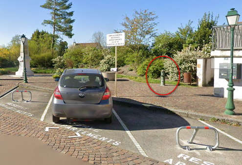 Sur le trottoir de droite en arrivant face à la mairie, proche du monument aux morts.
