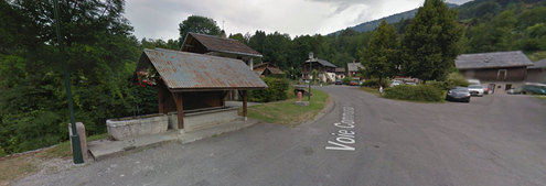 Une fontaine se trouve à côté du lavoir, en face d'un square arboré.