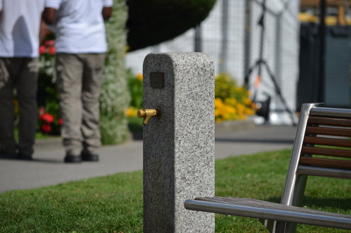 Un robinet se trouve sur le côté de la fontaine principale du monument commémoratif du centenaire de la Révolution, au centre de la place.