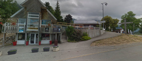 sur la gauche en arrivant de Talloires sous le bâtiment chalet d'accueil tourisme information à gauche des escaliers en béton