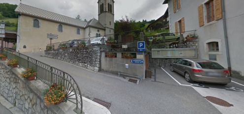 Côté gauche de la route en montant, sur la droite du bâtiment.