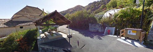 Des fontaines se trouvent au centre du village, groupées au même endroit : sur la photo on voit bien 2 fontaines et une borne verte.