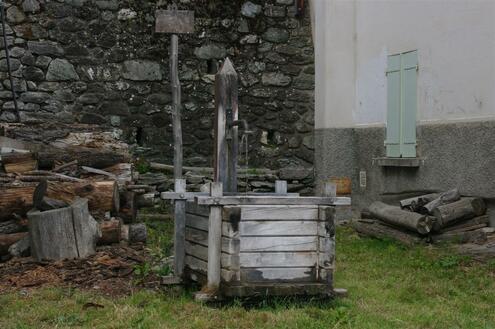 Fontaine située entre deux bâtiment dans la rue du Canton.