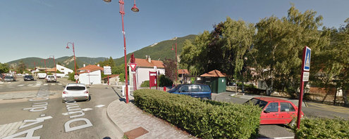 Les toilettes se trouvent dans un bâtiment carré de couleur verte, sur un parking le long de la route, au niveau d'un petit rond point, le long de la route principale.