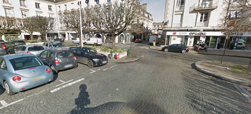 Petite fontaine peinte en vert de la taille d'une borne incendie juste à coté d'un panneau et d'une borne à incendie rouge. Sur le parking donc un peu difficile à trouver.