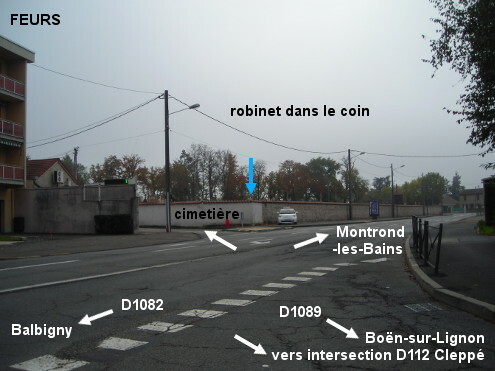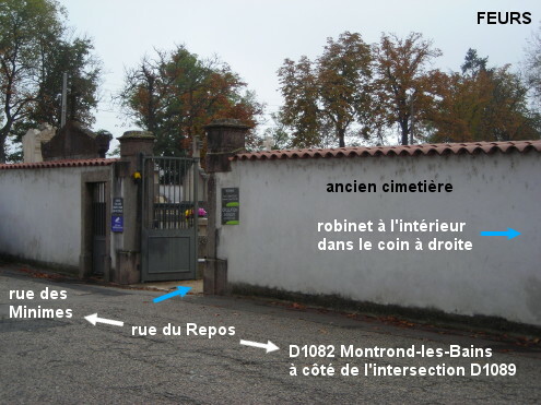 L'ancien cimetière est situé en ville le long de la D1082, à proximité de l'intersection D1082 / D1089 (routes à très grande circulation). En provenance de Cleppé par la D112 ou de Chambéon par la D107, qui rejoignent la D1089 juste avant le début de la ville, aux feux tricolores à l'intersection avec la D1082, le plus simple est de traverser comme piéton sur les passages pour rejoindre en diagonale sur la droite la rue du Repos dans laquelle se trouve l'entrée du cimetière sur le côté droit. Entrer dans le cimetière et se diriger vers le coin à droite pour trouver le robinet sur le mur entre deux tombes. N.B. : Le cimetière est ouvert de 7h30 à 20h du 01 avril au 31 octobre ou de 7h30 à 16h30 du 01 novembre au 31 mars. P.S. : Si l'on va au bout de la rue du Repos et qu'au carrefour en T on prend à gauche la rue des Minimes, puis si l'on continue tout droit jusqu'à un mini rond-point plat et que l'on va vers la droite (rue Waldeck-Rousseau), on finira par arriver sur un carrefour où la route sur la droite est la suite de la D112 (direction Saint-André-le-Puy).