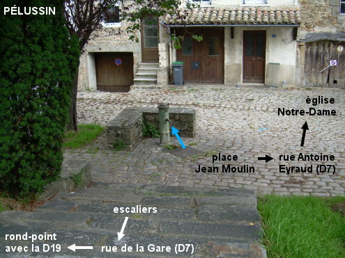 Cette borne se trouve sur une placette dans un virage de la D7, en face d'un carrefour avec une rue en sens interdit, et en centre-ville entre l'église Notre-Dame (celle des deux églises qui est au bord de la D7) et le rond-point avec la D19 direction Chuyer (par la D19 puis la D30). 1) En provenance de Saint-Michel-sur-Rhône sur la D34, au rond-point sur la D7 prendre la première sortie en direction du centre-ville. Rouler tout droit pendant un long moment, puis après avoir dépassé l'église Notre-Dame érigée côté gauche on verra en face le sens interdit d'une rue adjacente tandis que la D7 aborde un virage à droite. Juste derrière le passage piéton entrer à droite sur la placette pavée et avancer de quelques pas pour trouver la borne côté gauche en face d'escaliers et dans l'intérieur du L d'un muret. Il s'agit d'une borne Bayard à molette droite et il suffit de mettre cette molette en arrière (tourner en sens horaire) pour faire couler l'eau (le débit n'est pas très important), ensuite il ne faut pas oublier de ramener la molette en avant pour couper l'eau. 2) En provenance de Chuyer sur la D30 puis la D19, au rond-point avec la D7 (la D19 se superpose alors à la D7) prendre la deuxième sortie : la D7 direction Chavanay. Plus loin, après une rue adjacente à gauche, puis en fin de virage à gauche et juste avant le passage piéton entrer sur la placette pavée bordée de maisons qui est à gauche dans l'intérieur du virage, pour trouver la borne à quelques pas (susceptible d'être masquée par des voitures garées sur ladite placette).