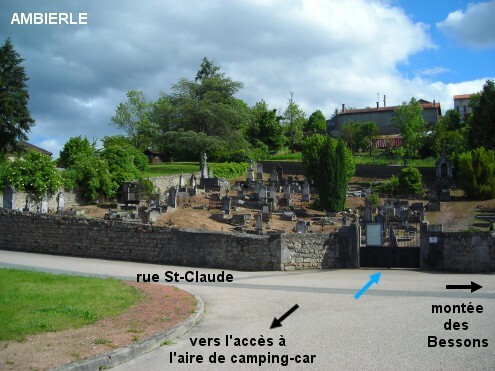 Le premier cimetière d'Ambierle est situé en périphérie du village, à 670 mètres de la D52. A partir de la D52 en provenance de St-Bonnet-des-Quarts, après avoir passé l'église sur la droite, tourner à gauche devant le clocher St-Nizier (fléchage aire camping-cars), continuer dans la rue de la Grye (plusieurs intersections et courbes) jusqu'à un simili rond-point minuscule. A cet endroit, prendre la rue en face légèrement sur la gauche qui passe entre un grand bâtiment et un parking, continuer au-delà de l'allée qui dessert l'aire-service pour camping-cars, jusqu'à un carrefour en T entre la rue Saint-Claude (à gauche) et la montée des Bessons (à droite), le cimetière est là juste en face. Le robinet est à l'intérieur de ce cimetière, à gauche du portail. N.B.: L'itinéraire décrit ici est le plus simple pour accéder au cimetière, plutôt que par des ruelles qui conduisent à l'autre extrémité de la rue Saint-Claude.