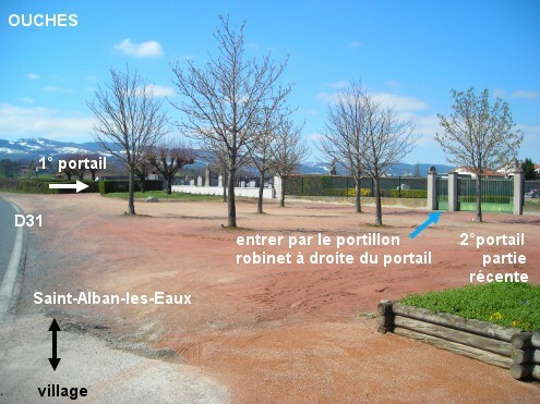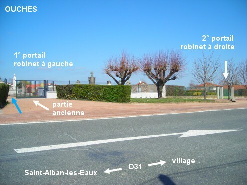 Le cimetière est implanté côté gauche très en retrait par rapport à la route D31 en provenance de Saint-Alban-les-Eaux, 70 mètres avant le panneau de début de village. Il comporte deux portails et deux robinets. Si l'on entre par le premier portail (portail de gauche bordé par deux longues haies et donnant dans la partie ancienne), on trouvera le premier robinet immédiatement à gauche à l'intérieur. Si l'on entre par le portillon à côté du deuxième portail (le plus proche du village et donnant dans la partie la plus récente du cimetière), on trouvera le deuxième robinet à droite du portail, lui-même à droite du portillon.