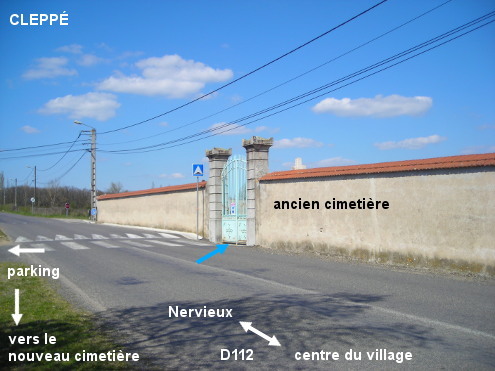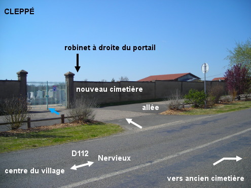 Le cimetière est implanté à la sortie du village sur la D112 en direction de Nervieux. Il est composé de deux parties situées de part et d'autre de la route et presque en face l'une de l'autre. La partie la plus ancienne est celle côté droit, la partie la plus récente est celle côté gauche (et un peu plus proche du village) quand on roule en direction de Nervieux après le carrefour avec la D68 venant de Sainte-Foy-Saint-Sulpice. Dans chacune des parties du cimetière, le robinet est à l'intérieur et à droite du portail.