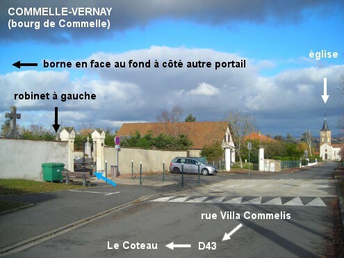 Ce cimetière est situé non loin de l'église du bourg de Commelle (la commune est issue de la fusion de deux villages). Il possède deux entrées dans deux rues parallèles, et deux points d'eau différents. 1) A partir de la D43 en direction du Coteau, 470 mètres après le panneau marquant le début de la ville, au grand carrefour (annoncé par le deuxième panneau ''intersection avec priorité à droite'') tourner à droite dans la rue Villa Commelis en direction du cimetière et de l'église (celle-ci est située 160 mètres au-delà du cimetière). Le cimetière ne se voit pas à l'avance car en retrait par rapport à la rue et derrière une haie perpendiculaire à celle-ci. Il est implanté côté gauche (à côté du n°265) face au passage piéton, 240 mètres après le carrefour. En entrant par ce premier portail, on trouvera immédiatement à gauche un robinet (N.B. : le deuxième portail est en face du premier, sur le mur arrière). 2) A partir de la D43 en provenance du Coteau, 1940 mètres après le rond-point D43 / D56 et 450 mètres après le 2° rond-point, une flèche basse à gauche au début de la rue Marie Curie indique ''parking cimetière''. Celui-ci est ensuite accessible sur la droite 80 mètres plus loin, après une grande haie végétale. Continuer au-delà du premier parking entouré de haies jusqu'à la place du 19 mars 1962 pour trouver le deuxième portail. A l'intérieur, à gauche de ce deuxième portail il y a une borne pompe à eau (actionner la molette droite dans un mouvement de va-et-vient pour faire couler l'eau). P.S. : Le robinet est concerné par une coupure d'eau hivernale, mais l'eau coulait encore à la borne vers la mi-décembre 2021.