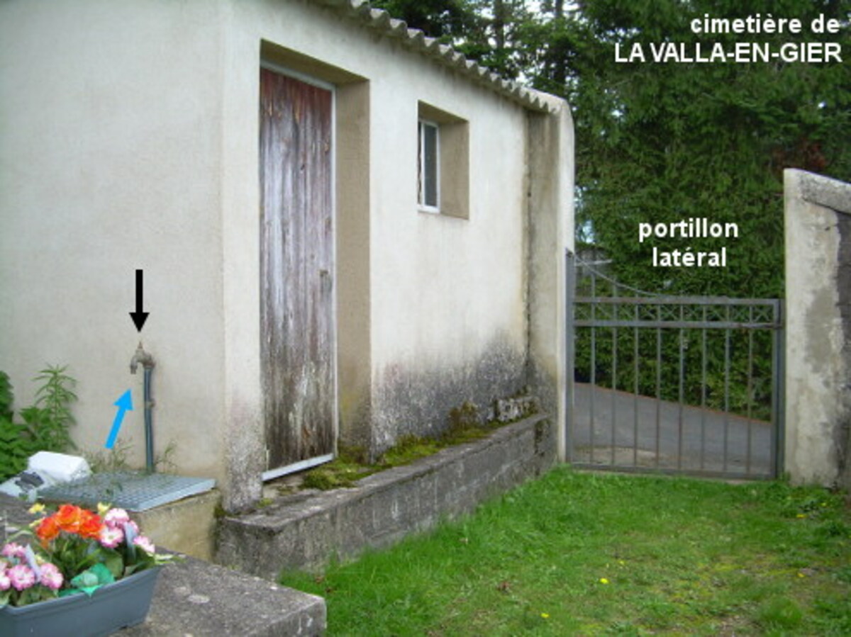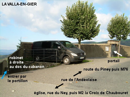 Le cimetière est implanté sur les hauteurs du village dans une rue secondaire, à 760 mètres de la M2. En descendant du col de la Croix de Chaubouret sur la M2, prendre la troisième à droite (rue du Ney) sur un embranchement en Y situé juste après un haut mur en surplomb et avant un bâtiment. Le début de ladite rue est bordé à droite par un mur sur lequel il y a des gros croisillons métalliques et elle remonte. Continuer tout droit, dépasser l'église érigée côté gauche sur un replat, puis dans la rue de l'Andéolaise qui fait suite monter à nouveau, jusqu'au cimetière implanté côté gauche. Ne pas aller jusqu'au portail mais descendre à peine quelques mètres dans la rue adjacente à gauche pour entrer par le portillon latéral. On trouvera alors le robinet à droite au dos du cabanon qui est dans le coin (ou sinon, le robinet est à 25 mètres à gauche du portail via deux marches d'escaliers et une allée en herbe). P.S. : En continuant au-delà du cimetière dans la route du Piney suite à la rue de l'Andéolaise, et qui redescend, on débouchera environ 1 km plus loin sur la M76 (avec à droite la direction de Doizieux, ou à gauche le retour sur la M2 direction Saint-Chamond). ATTENTION : Vers la fin de la descente sur la route du Piney il y a deux rigoles métalliques en travers de la chaussée, à franchir à faible vitesse sous peine d'endommager ses roues de vélo !