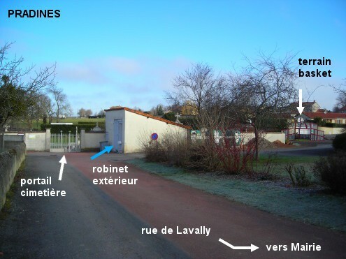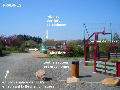 Le cimetière est à l'intérieur du village et desservi par une rue secondaire. 1) A partir de l'intersection D27 / D45, prendre la D27 direction Le Coteau puis tourner à gauche avant l'église. Suivre la rue qui forme un Z (courbes à droite puis à gauche), il y a ensuite une longue place côté droit puis on arrive face à la Mairie derrière l'obélisque du Monument aux Morts. Prendre la branche du Y à droite de la Mairie (rue Péchenille) puis tourner à droite (rue Lavally). Le cimetière est au fond en face, derrière la suite de la rue qui oblique à droite. Le robinet est à l'extérieur, vers l'angle du bâtiment qui est à droite du portail droit du cimetière (à 280 m de la D27). 2) En provenance du Coteau sur la D27, en suivant la flèche cimetière l'itinéraire est le suivant : tourner à droite (rue du 14 juillet) et continuer tout droit jusqu'à la Mairie, ensuite idem ci-dessus (ainsi le cimetière est à 310 m de la D27). N.B. : Si avant d'arriver à la Mairie on a tourné à droite dans la rue Lavally, on arrive sur une grande esplanade recouverte d'une grosse épaisseur de gravillons, au bord de laquelle il y a un terrain de basket récent, derrière lequel on aperçoit les croix dépassant du mur du cimetière. Se diriger vers la gauche jusqu'au bâtiment sur la droite qui est à côté du portail du cimetière (dans ce cas le cimetière est à 210 m de la D27). Si en repartant, vers la Mairie on tourne à droite, on sera sur la D45 direction Notre-Dame-de-Boisset.