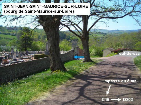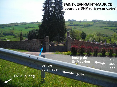 Ce cimetière, visible depuis la D203 en provenance de Bully, est implanté au fond d'une impasse à la périphérie du bourg de Saint-Maurice, la commune étant issue de la fusion de deux villages : Saint-Jean-le-Puy et Saint-Maurice-sur-Loire. Sur la D203 en provenance de Bully, 170 mètres après le panneau de début de village, tourner à droite dans la voie C16 en direction du bourg de Saint-Maurice, de nouveau à droite 50 mètres après, dans l'impasse du 8 mai. Le cimetière est implanté côté gauche 100 mètres plus loin, vers le fond de l'impasse. Le robinet est à l'intérieur du cimetière, à gauche du portillon. N.B. : Pour faire couler l'eau, il faut frapper fortement et de manière répétée sur le bouton-poussoir.