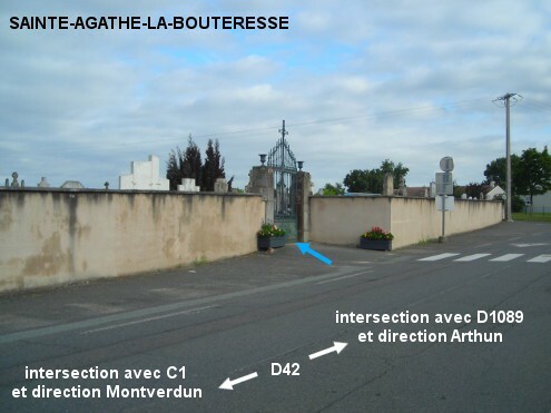 Le cimetière est implanté côté gauche à la sortie du village sur la D42 en direction d'Arthun, entre l'intersection avec la voie C1 (la Mairie occupe le deuxième angle à droite), et l'intersection avec la D1089. Le robinet est à l'intérieur du cimetière, à gauche du portail.