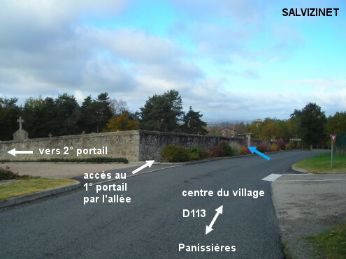 Le cimetière est implanté côté gauche à l'entrée du village sur la D113 en provenance de Panissières, 130 mètres après le panneau de début de village, entre un parking et des terrains de basket, dans une portion de route descendante. Pour accéder au premier portail (celui côté route), prendre l'allée piétonne en dur qui longe le cimetière entre son mur avant et une bande végétalisée, soit par son extrémité côté parking, soit par son autre extrémité si l'on arrive du centre du village (dans ce sens le cimetière est situé à hauteur d'un panneau de signalisation indiquant une chapelle romane à 2 km). Le robinet est à l'intérieur du cimetière, à droite de ce premier portail.
