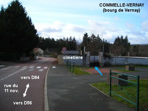 Ce cimetière est situé dans le bourg de Vernay (la commune de Commelle-Vernay est issue de la fusion de deux villages). Sur la D43 en provenance du Coteau, au premier rond-point tourner à droite sur la D56 en direction de Vernay, puis au deuxième rond-point (environ 1,5 km après le premier) tourner encore à droite en direction de Vernay (le cimetière est indiqué sur l'un des minuscules panneaux au bord du rond-point), on est alors dans la rue du 11 novembre. Le cimetière est implanté 400 mètres plus loin côté droit à l'angle avant l'intersection avec la rue Victor Dupré. Il comporte deux portails : le premier nous fait face derrière l'allée à droite qui dessert un parking et rejoint la rue Victor Dupré qui fait un L renversé depuis l'arrière du cimetière, le deuxième portail sis rue Victor Dupré est sur l'autre mur perpendiculaire à la rue du 11 novembre. C'est par le premier portail qu'il faut entrer, pour trouver sur la gauche dans le coin derrière le cabanon, une borne pompe à eau (il faut actionner la molette droite dans un mouvement de va-et-vient pendant longtemps pour faire couler l'eau). N.B. : Si l'on continue dans la ''rue du 11 novembre'', elle se prolonge en ''rue du Pont'' qui franchit un pont sur la Loire (à côté de carrières) et rejoint la D84 (à gauche c'est la direction de Villerest). Si l'on arrive par la D56 en provenance de Saint-Jodard, en suivant à gauche la direction du bourg de Vernay par la rue des Vignes, on arrive en bas sur la rue du 11 novembre que l'on doit prendre à droite pour aller vers le cimetière.