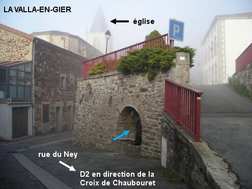 Cette fontaine est située dans une rue secondaire, non loin de l'église, à 100 mètres de la D2. A partir de la D2 en provenance de la Croix de Chaubouret, prendre la rue à droite qui mène à l'église (rue du Ney,au début de laquelle il y a de grands croisillons métalliques vissés sur le mur droit). La fontaine est implantée côté droit sous une voûte dans le mur en pierre, juste au-delà de l'accès à un parking. Le débit de cette fontaine est très faible (il faut être patient). AVERTISSEMENT : Cette fontaine n'est accompagnée d'aucun écriteau concernant sa potabilité. Mais on peut supposer que si sa consommation n'est pas interdite, c'est qu'elle n'est pas dangereuse. N.B. : Si on continue dans la rue du Ney qui se prolonge au-delà de l'église en rue de l'Andéolaise, on peut retrouver la D2 direction Saint-Chamond en descendant ensuite la première à gauche (attention, c'est un court raidard très pentu!).