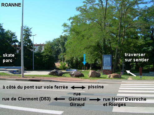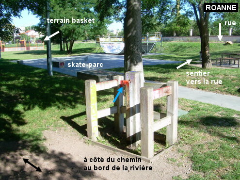 Ce robinet se trouve sur le sentier situé entre la rivière Le Renaison et le skate-parc aménagé à côté de la piscine Le Nauticum (fléchée) située en bordure du quartier faubourg Clermont et non loin de Riorges. 1) En provenance d'Ouches sur la D31 (puis la D3031 sur laquelle on arrive en roulant tout droit) au grand rond-point prendre la troisième sortie (bande cyclable depuis le rond-point précédent) en direction de la clinique du Renaison. Après être passé à côté de celle-ci sise côté droit (l'entrée dans Roanne n'est pas signalée par un panneau !), puis du Nauticum (en retrait derrière son parking), au rond-point attention : ne pas suivre ''fg Clermont'' mais continuer tout droit (deuxième sortie, bande cyclable) en direction du stade Griffon qui est juste après côté gauche. Ensuite après un boulodrome et des terrains de basket côté droit, on arrivera vers le skate-parc. Au niveau du passage piéton, quitter la rue pour prendre à droite le sentier à peine visible sur la pelouse entre deux parties du skate-parc jusqu'à rejoindre le chemin en terre qui longe la rivière. On sera alors tout près du robinet qui est fixé sur un support entouré de mini barrières en bois de protection sur trois côtés et à côté d'un arbre (à 30 mètres de la rue). 2) Au sortir de la gare SNCF, tourner à droite puis suivre la direction du faubourg Clermont : au premier rond-point première sortie puis au suivant juste après prendre la troisième sortie. Continuer tout droit jusqu'au stop et là traverser sur le passage piéton pour prendre à gauche du trottoir d'en face le chemin de terre qui longe la rivière et passe à gauche du skate-parc. Ensuite parcourir 100 mètres pour trouver le robinet côté droit.
