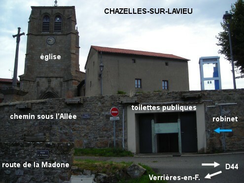 Les toilettes sont situées au début du "chemin sous l'Allée" sur le bord droit de la D44 en direction de Verrières-en-Forez, vers la sortie du village. Le robinet est fixé sur le mur extérieur à droite des portes d'accès aux WC.