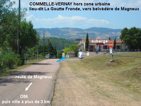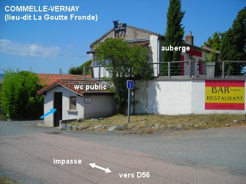 Ces toilettes sont situées loin en dehors de la ville, à plus de 3 km, au lieu-dit La Goutte-Fronde, au bout d'une route en impasse, à côté d'une auberge et à proximité de l'aire de loisirs de Magneux. 1) A partir du rond-point D18 / D56 près de la ville, prendre la D56 en direction de Cordelle et 2,20 km plus loin, à un endroit où la D56 vire à gauche, aller tout droit dans la route de Magneux. Celle-ci est repérable de loin grâce à la bâtisse caractéristique d'un hôtel implanté à droite à son début, qui est composée d'un premier niveau avec toiture, d'un deuxième plus petit avec toiture, surmontés par une tour carré. Il y a aussi un ensemble de panneaux sous la bannière ''aire de loisirs de Magneux''. On trouvera le petit bâtiment des toilettes 360 mètres plus loin sur le bord droit de la route, bien après la vaste aire de jeux, et juste après le parking d'une auberge. Il est accolé au mur à côté de cette auberge, il est porteur d'une pancarte ''WC public''. 2) Dans l'autre sens de circulation sur la D56, on trouvera la route de Magneux (virage à gauche en épingle, là où une flèche pointe la direction de Cordelle d'où l'on vient) 4,78 km après le carrefour D56 / D45 situé à coté de Cordelle.