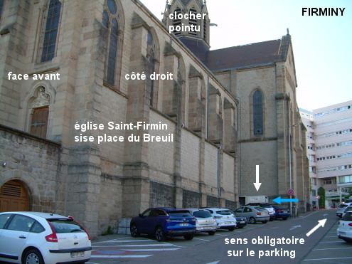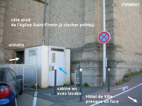 Ces toilettes sont accolées à l'église Saint-Firmin, qui a un clocher pointu (il y a deux églises en ville) et qui est érigée au fond de la place du Breuil, immense place avec parking, autour de laquelle la circulation se fait en sens unique, et qui est située au bord de la M88 qui traverse le centre-ville. Ces toilettes se trouvent également presque en face de l'Hôtel de Ville (fléché) sis au milieu du côté droit de la place. Il s'agit d'une cabine auto-nettoyante (il y a aussi des urinoirs derrière, accessibles par le côté gauche) dotée d'un lavabo-boite tri-fonction muni d'une cellule à détection pour la commande de l'écoulement de l'eau. N.B. : Il faut incliner le bidon pour l'enfiler dans l'espace du lavabo, mais ensuite on peut le redresser et il passe sans problème sous le jet d'eau. 1) Au sortir de la gare SNCF, faire le crochet à droite en suivant le sens obligatoire pour aller prendre l'avenue de la Gare qui est en face de la gare. Aux feux tricolores, tourner à droite (M88 direction Le Puy-en-Velay) puis peu après tourner dans la première à gauche (c'est le côté gauche de la place du Breuil, et il y a aussi une flèche ''Hôtel de Ville''). Monter presque jusqu'à l'église puis entrer à droite sur le parking. Ensuite, à vélo on pourra couper à gauche à travers pour rejoindre à gauche une autre allée du parking qui monte en sens unique à la droite de l'église. On trouvera la cabine WC après les places de stationnement situées le long de l'église et dans un coin de l'église (à 170 mètres de la rue Jean Jaurès, portion de la M88). P.S. : Pour repartir, on peut soit continuer dans cette allée puis tourner deux fois à droite pour prendre le côté droit de la place du Breuil, soit prendre l'allée à contresens pour rejoindre au plus court le côté droit de la place à côté de l'Hôtel de Ville, on pourra alors redescendre dans le bon sens sur la rue Jean Jaurès (à 120 mètres du WC). 2) En venant de Saint-Ferréol-d'Auroure sur une petite route (au carrefour où la D6 fait un angle droit et où une rue adjacente conduit à la Mairie, prendre la direction opposée à la flèche ''D6 Firminy'' qui fait passer par la RN 88), à Firminy au premier rond-point prendre la première sortie (flèche ''site Le Corbusier'') puis rouler toujours tout droit (c'est la M88). Après trois ronds-points puis un feu tricolore on verra côté droit la grande place avec sur l'avant un arrêt de bus et une grosse sphère, et sur l'arrière un grand parking et l'église à clocher pointu, avancer encore de quelques mètres pour prendre à droite la rue en sens unique qui monte le long du côté gauche de la place. Puis passer à la droite de l'église pour trouver les toilettes comme au point 1.