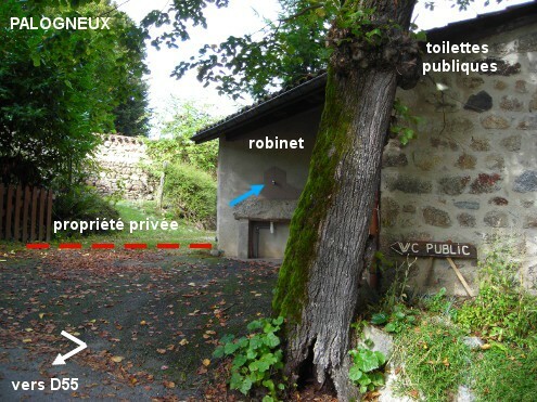 Les toilettes sont situées non loin de l'église. A partir de la D55 en provenance de Saint-Just-en-Bas, tourner à gauche dans la montée Saint-Pierre en suivant la direction de la Mairie, puis 190 mètres plus loin (au-delà de la Mairie) tourner à gauche (quelques mètres avant l'église) dans la suite de la montée Saint-Pierre (il y a une grosse pancarte en bois signalant la ''salle Pulsatile'' et une flèche indiquant la direction du cimetière). Le petit bâtiment en pierre des toilettes est implanté à droite juste après le carrefour (il y a une flèche ''WC public''), face à une aire de jeux et avant l'entrée d'une propriété privée.