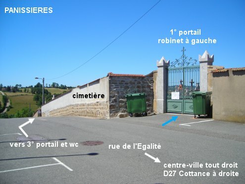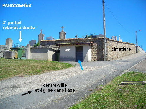Ces toilettes se trouvent à côté du troisième portail de l'ancien cimetière, lui-même situé dans une rue secondaire à proximité de la D27 direction Cottance. Sur la route principale qui fait le tour de l'hypercentre, au carrefour où il faut marquer un stop et où une rue en sens interdit arrive de l'église, prendre la rue opposée (rue de l'Egalité) et 50 mètres plus loin continuer tout droit (la branche gauche du Y est la D27 direction Cottance). L'ancien cimetière est implanté côté droit 190 mètres plus loin (distance à son premier portail). On trouvera un premier robinet à l'intérieur du cimetière à gauche du premier portail, un autre robinet intérieur à droite du troisième portail (à 190 mètres du premier, en descente), et un lavabo dans le cabanon des toilettes accolé au cimetière à droite du troisième portail. N.B. : Pour arriver au premier carrefour cité, les instructions sont les suivantes selon notre provenance. 1) De Cottance par la D27, au carrefour en T tourner à gauche (il y a une flèche ''cimetière'' mais pour ceux qui arrivent de la droite : de Feurs par la D60). 2) De Feurs par la D60, vers l'Office du Tourisme prendre une première fois la branche gauche du Y mais ensuite ignorer la direction Cottance par D27 pour continuer tout droit en suivant la flèche ''cimetière''. 3) D'Essertines-en-Donzy par la D103, suivre la direction de Cottance jusqu'à l'Office de Tourisme puis idem point 2. Dans ces trois cas on arrive au carrefour avec stop par la rue Jean-Benoît Guerpillon. 4) De Montchal par la D103, il suffit de rouler tout droit pour arriver à ce carrefour avec stop, par le boulevard Jacquart. 5) De Violay par la D60, continuer tout droit en direction du centre-ville puis de la Mairie (à un moment, face à un sens interdit, on fait droite / gauche pour rejoindre le boulevard Jacquart).