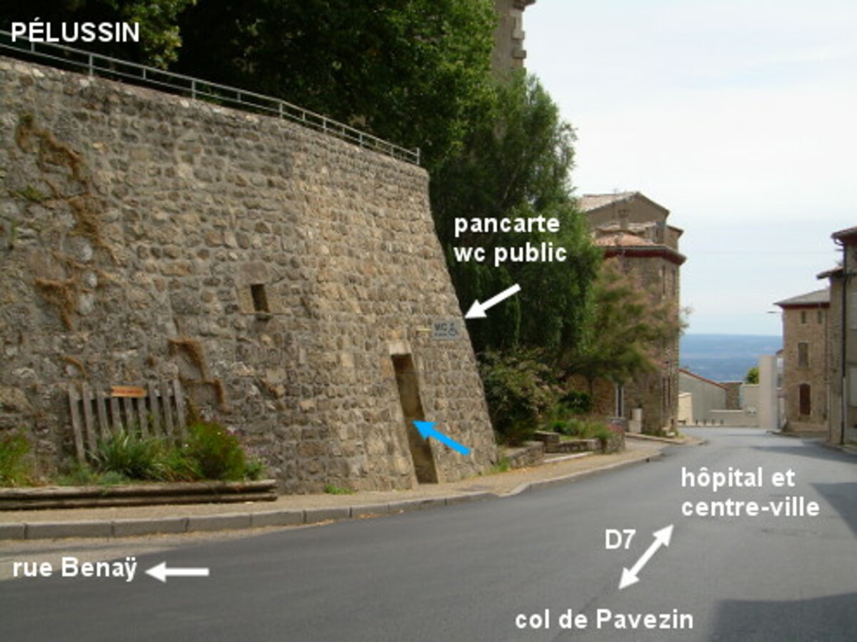 Ces toilettes sont incluses dans le haut mur des anciens remparts de la ville après l'hôpital local et peu avant la sortie de la ville sur la D7 en direction du col de Pavezin (sur les flèches c'est La Grand-Croix beaucoup plus loin qui est indiquée). 1) En venant de Maclas sur la D19, au carrefour en T sur l'extérieur d'un virage en épingle de la D7, tourner à gauche en suivant la direction de La Grand-Croix. Après l'hôpital local sis côté droit sur l'extérieur d'un virage, surveiller le côté droit, on verra un peu plus loin les anciens remparts juste avant un carrefour en Y dans la fourche duquel il y a une très grande croix. L'entrée des toilettes dans le mur est surmontée d'une pancarte ''WC public'' perpendiculaire au mur et visible dans les deux sens. 2) En descendant du col de Pavezin sur la D7, c'est le côté gauche qu'il faut surveiller pour repérer, à environ 645 mètres du panneau marquant le début de la ville, les anciens remparts et la pancarte signalant le WC.