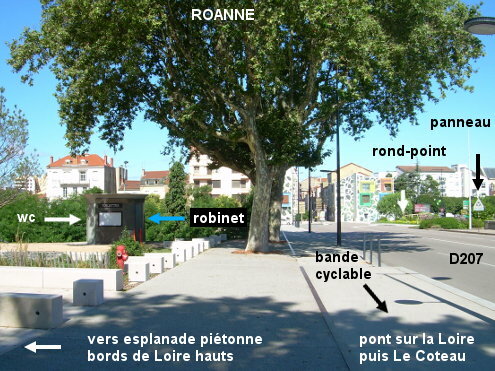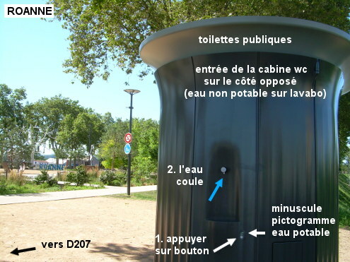 Ces toilettes se trouvent au bord de la D207 près du pont sur la Loire reliant Roanne au Coteau. 1) En provenance du Coteau sur la D207, juste après le pont sur la Loire s'arrêter aux feux et appuyer sur le bouton d'appel afin de pouvoir traverser sur le passage piéton (sinon, on peut faire demi-tour au rond-point peu après). Parcourir 50 mètres sur le trottoir de gauche (bande cyclable en sens inverse) jusqu'au petit bâtiment ovale des toilettes. ATTENTION : L'eau du lavabo à l'intérieur n'est pas potable mais sur l'extérieur côté rue, il y a une niche avec un robinet d'eau potable (cf pictogramme ad-hoc) dont l'écoulement est commandé en appuyant sur un bouton situé en bas à droite de ladite niche. 2) À partir de Roanne, suivre la direction du Coteau et juste après le rond-point situé près du port de Roanne sur le canal et peu avant le pont sur la Loire, prendre la bande cyclable sur le trottoir pour arriver 70 mètres après à hauteur des toilettes côté droit. N.B. : Ces toilettes ont été mises en service en juillet 2023.
