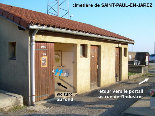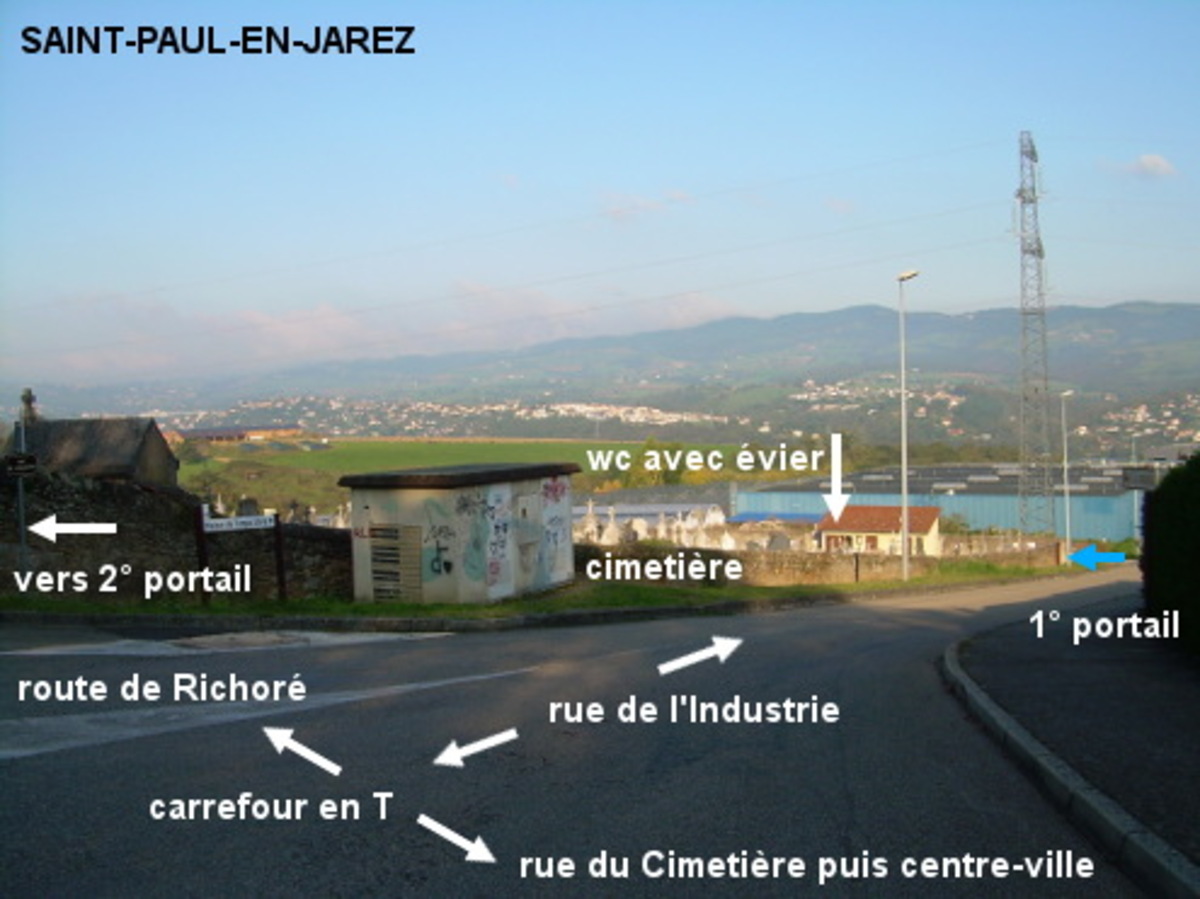 Le cimetière est implanté au nord du village, à l'angle de la route menant au lieu-dit Richoré et d'une rue menant à la Zone Industrielle des Fraries. Ses toilettes se trouvent près du portail sis rue de l'Industrie. 1) À partir de l'anneau qui fait le tour de l'hypercentre en sens unique, après la Mairie sise côté droit, ignorer la première rue qui est en impasse, tourner dans la suivante (rue du Cimetière) en direction du lieu-dit Richoré. Rouler tout droit pendant 490 mètres, on verra alors le cimetière implanté côté droit derrière la troisième rue adjacente (rue de l'Industrie). Tourner à droite dans cette rue et descendre jusqu'au portail situé vers l'autre coin (à 610 mètres de l'anneau autour du centre bourg). Entrer et avancer de 15 mètres jusqu'au petit bâtiment contre le mur à droite, dans lequel il y a les toilettes. N.B.1 : Il y a un grand évier avec deux robinets, au-dessus duquel une affiche indique que « chaque année en période hivernale, l'eau sera coupée au cimetière du 20 novembre au 20 mars ». N.B.2 : Le cimetière est ouvert de 7h à 20h du 01 avril au 04 novembre ou de 9h à 18h du 05 novembre au 31 mars. 2) En provenance de Cellieu et La Grand-Croix sur la M106 puis la M88 et enfin la M7 (la direction de Saint-Paul-en-Jarez est bien indiquée, et au rond-point M88 / M7 c'est la troisième sortie), surveiller le côté droit de la route pour repérer les flèches ''cimetière'' et ''Z.I. des Fraries'' (première à droite 400 mètres après le rond-point sur la M7). Tourner alors à droite puis au carrefour en T à gauche, et monter en direction du cimetière. Celui-ci est implanté côté droit (à 540 mètres de la M7). Entrer par le portail au début du cimetière pour trouver les toilettes en face. P.S. : Il n'y a pas de robinet à proximité du deuxième portail sis route de Richoré (située en face de la rue du Cimetière).