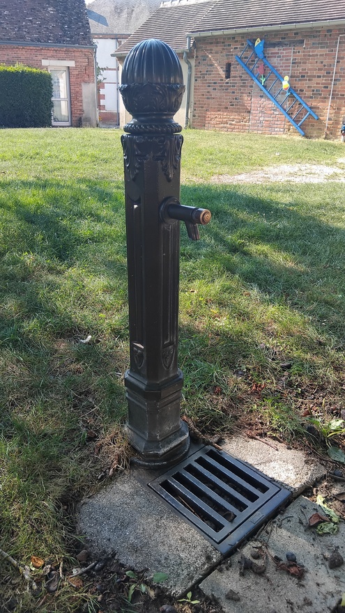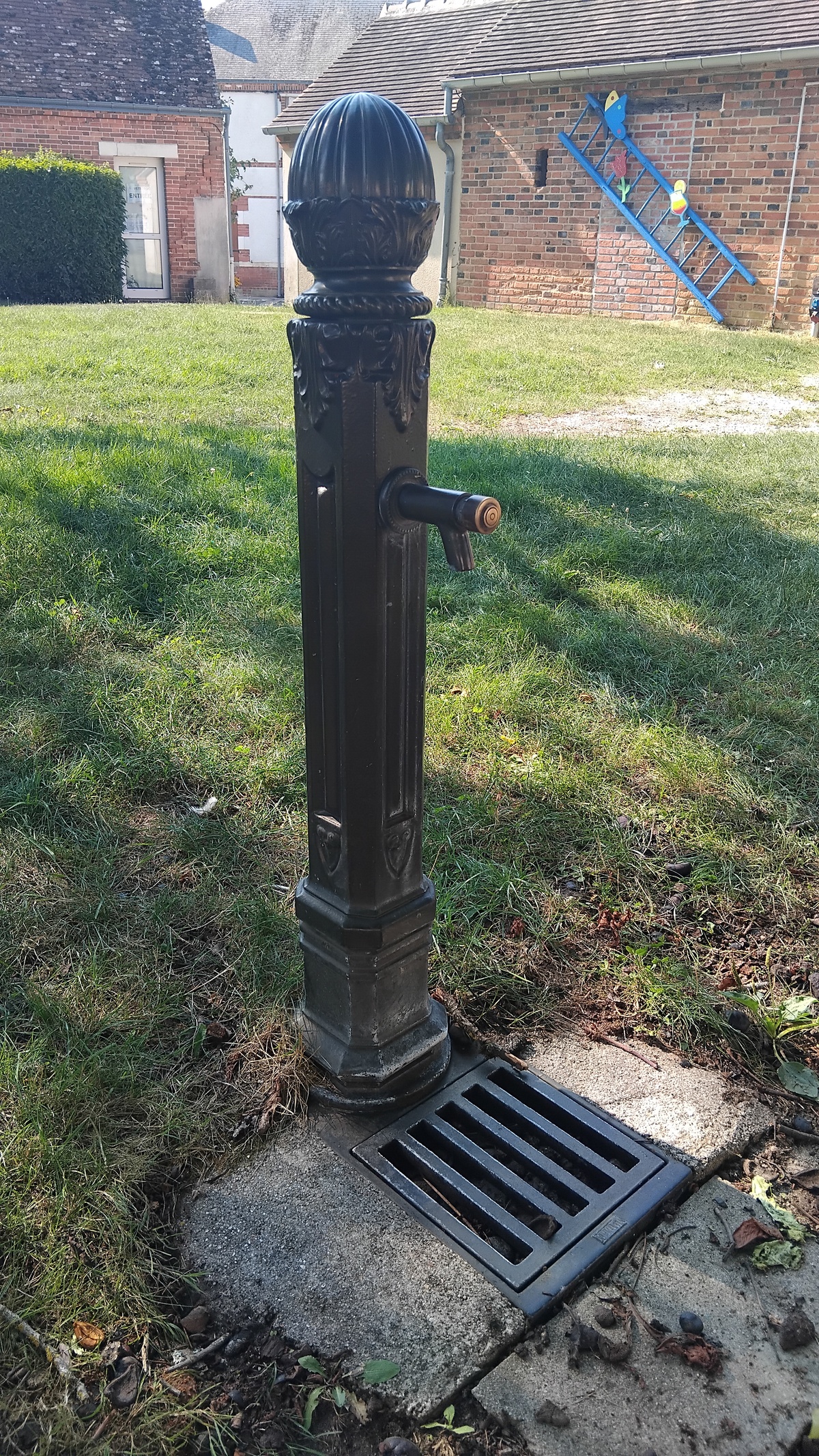 Robinet situé sur la pelouse de la place de l'Église, entre un banc et une borne à incendie. Des toilettes publiques avec lavabo se trouvent à côté, dans un petit bâtiment en briques.