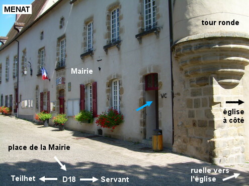 Les toilettes se trouvent dans le même bâtiment que la Mairie sise sur une place située au bord de la D18, non loin de l'église. 1) En provenance de Teilhet sur la D18, au centre du village lorsque l'on verra côté gauche la façade de la Mairie derrière une place arborée, entrer sur ladite place (il y a aussi une flèche pour indiquer la Mairie). La porte des toilettes est située à droite de l'entrée de la Mairie. Elle est identifiée par une pancarte et par les lettres WC à sa droite sur le mur. N.B.1 : En plus du lavabo, il y a un robinet-papillon sous celui-ci. N.B.2 : L'eau de la fontaine au fond de la place vers la médiathèque est non potable. 2) En provenance de Servant sur la D18 (il faudra sur l'itinéraire emprunter 680 mètres de D2144 à très grande circulation en faisant gauche / droite pour récupérer la suite de la D18 et entrer dans le village de Menat), peu après l'église érigée en retrait côté droit, entrer à droite sur la place de la Mairie en suivant la flèche. La porte des toilettes est sur la droite, après la tour ronde située à l'angle avec la ruelle menant à l'église, et avant la Mairie.